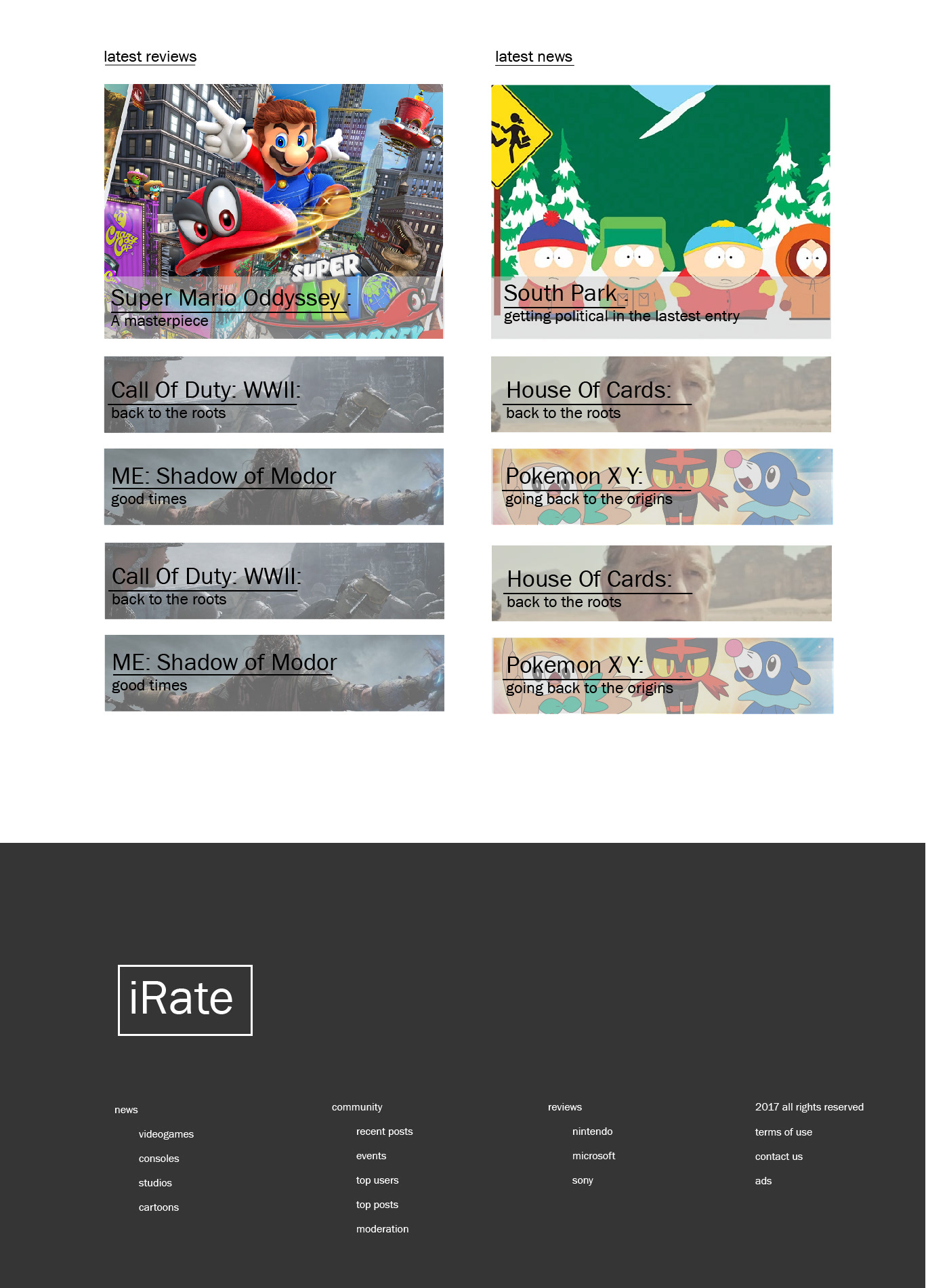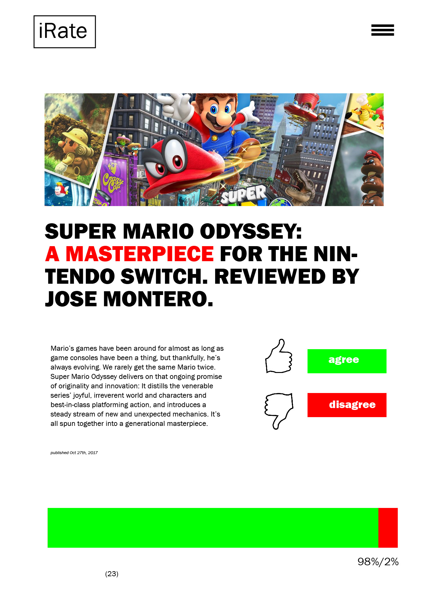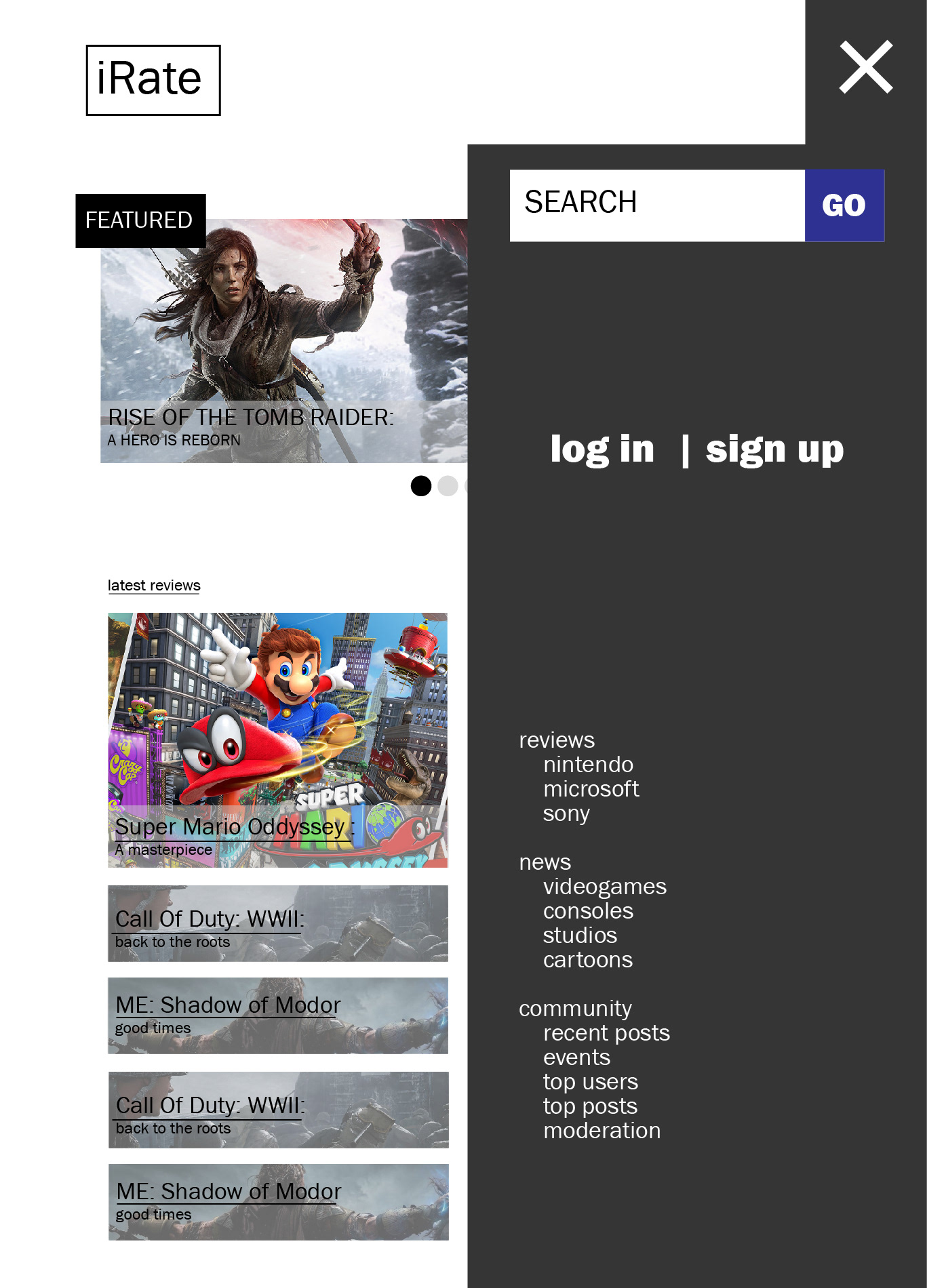 I envision a website that dedicates mainly to publishing video games reviews. But what is different about my vision than existing online reviews magazines? It seeks to eliminate the discourse created in the online gaming community by getting rid of the vague scoring system of the scale 1 to 10. Instead , iRate editors give a short statement on the game being reviewed and users can either agree with the opinion given or disagree.